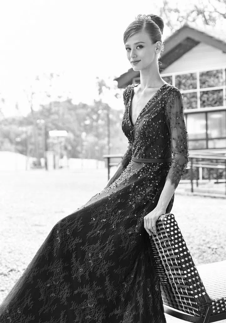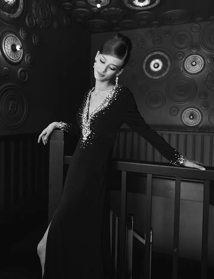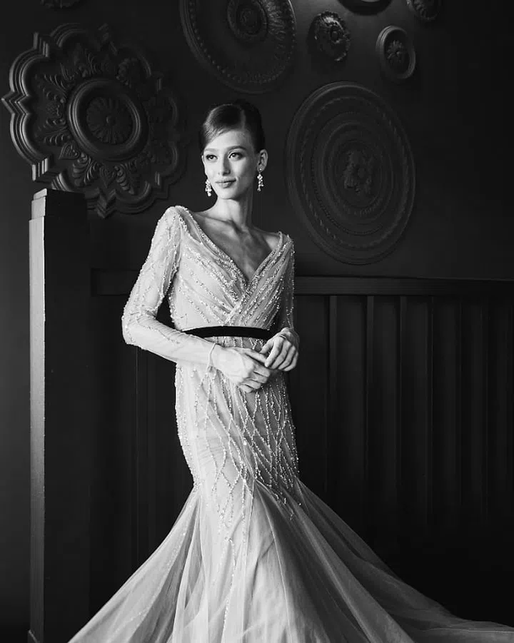 It's a throwback to the glittering glamour of the 30s with this heavy-embellished V-neck gown with graceful drapes.