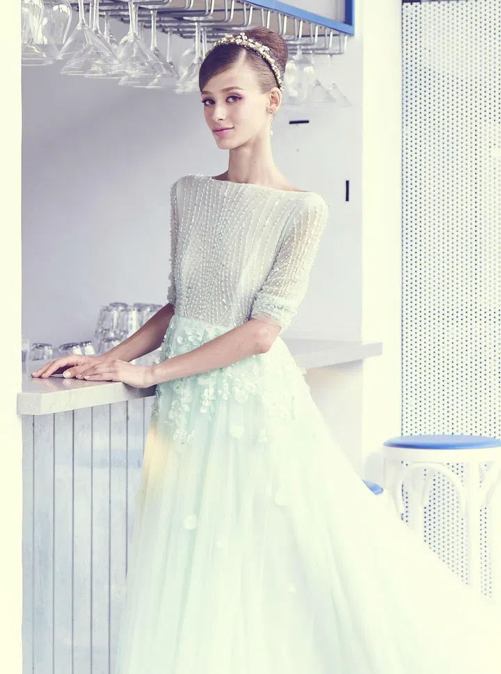 This delightful pastel gown gives vintage chic a refreshingly youthful and breezy spin. Lovely for both daytime or evening celebrations, we think.