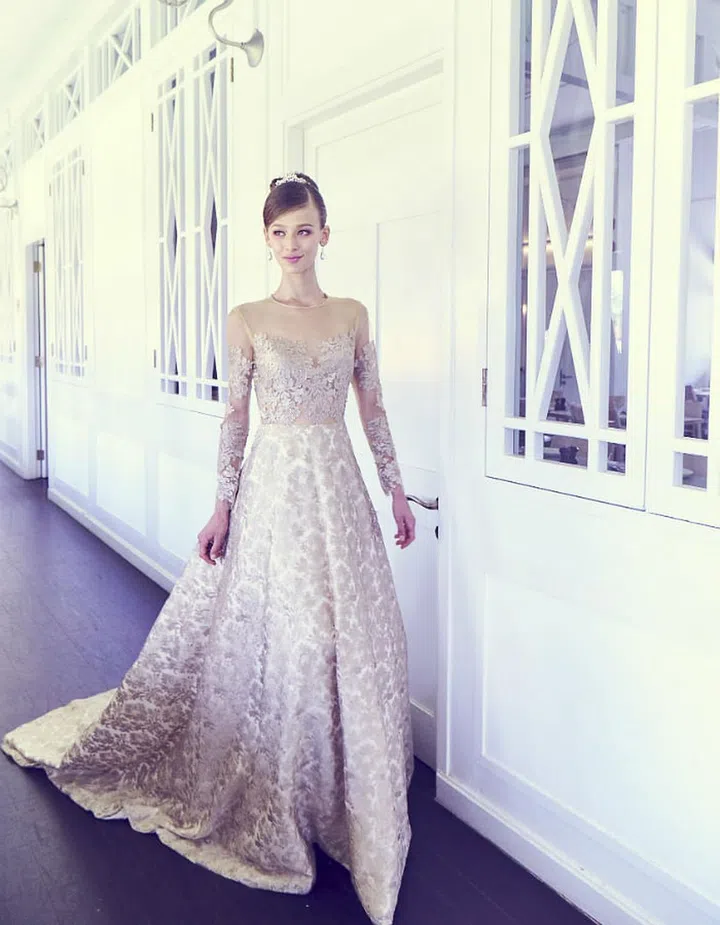 Lace gown with netting and chapel train, price upon enquiry from RICO-A-MONA.