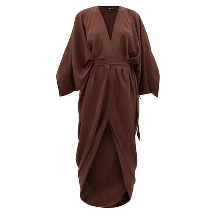 Founded in 2019, Sydney-based label Théa is the new kid on the block when it comes to covetable luxury clothing; that’s not to say the brand doesn’t know its stuff – THÉA’s collection of minimalist dresses are artfully draped using luxe fluid fabrics, showcasing the brand’s sensitivity to expert techniques. This brown dress showcases the brand’s knack in draping. Crafted from silk georgette with wise kimono-inspired sleeves, this dress offers a sexy twist with a wrap-around design secured by a tonal ribbon, giving rise to slit at the front. Team this dress with sleek block heeled booties, an elegant updo and a top handle box bag for both the office and a romantic dinner date afterwards.