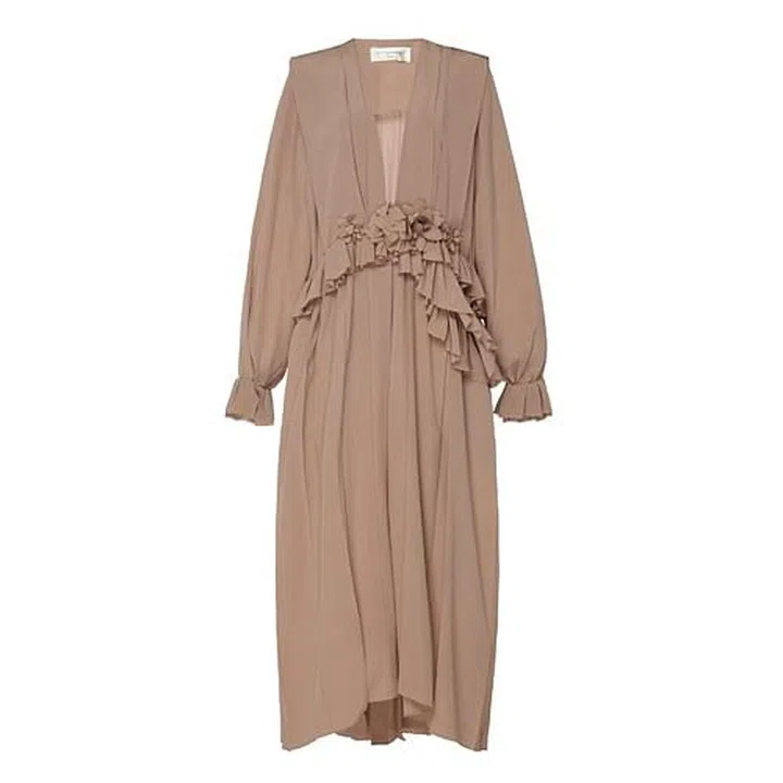 Victoria Beckham’s ethereal silk-chiffon dress features a midi-length undulating hemline, flouncy ruffle trimmings, and relaxed bell sleeves to underline the subtle bohemian feel. Washed in a rosy beige hue, this dress looks like an absolutely snug number to slip into. Pair it with an oversized tailoring jacket in a neutral colour, minimalist slides and simple gold earrings for a contemporary look.