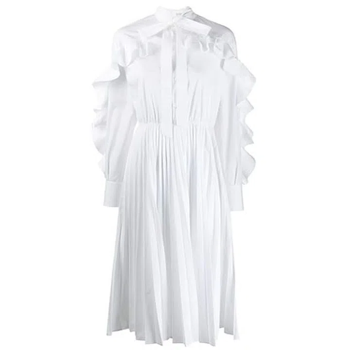Crafted with a pleated skirt and ruffles that trace the collarbone, leading to the sleeves, this white shirt dress by Valentino showcases the House’s expert craftsmanship and flair for femininity. Just as how a Little Black Dress is central to every woman’s wardrobe, a well-made crisp white dress is also an essential staple you need to own. Team this number with a pair of sleek and clean kitten heeled mules and a brightly coloured crossbody bag to give the ensemble a pop of colour.