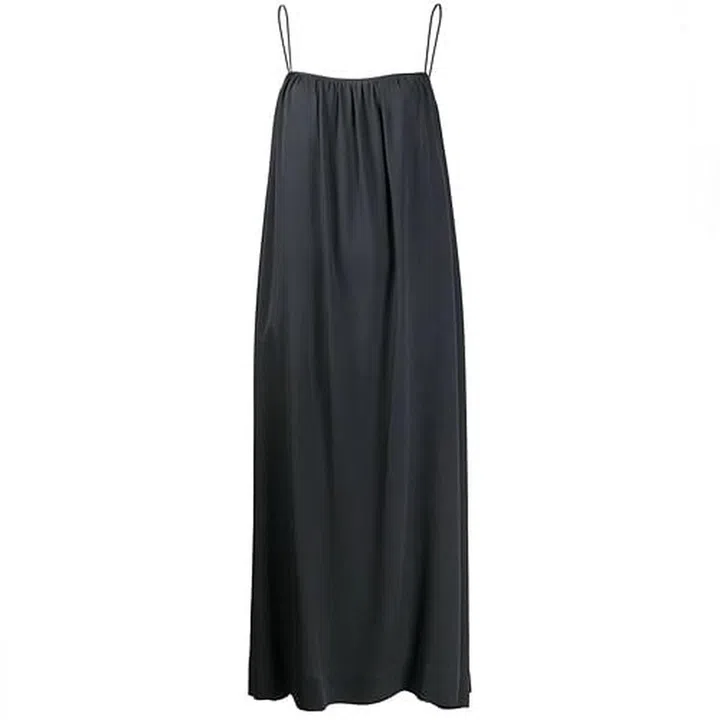Featuring thin spaghetti straps, a contemporary square neckline and a long hemline, this understated dress from The Row is an elegant and chic take on the average slip dress. Even with its voluminous silhouette, this 100% silk dress delicately frames the figure and drapes gracefully around the body. Team this with an oversized grey blazer, or switch things up with a fun plaid printed jacket, and a pair of flats.