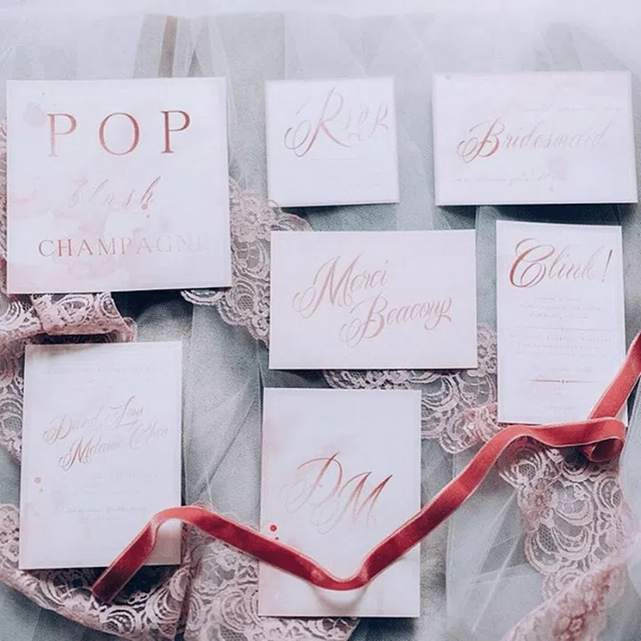 A minimal, soft pink invite that focuses mostly on the handwritten rose gold font, gives off a ballet themed feel, designed by Truly Enamoured. Perfect for the girly bride, this wedding suite will have your guests wondering what to expect on your big day.