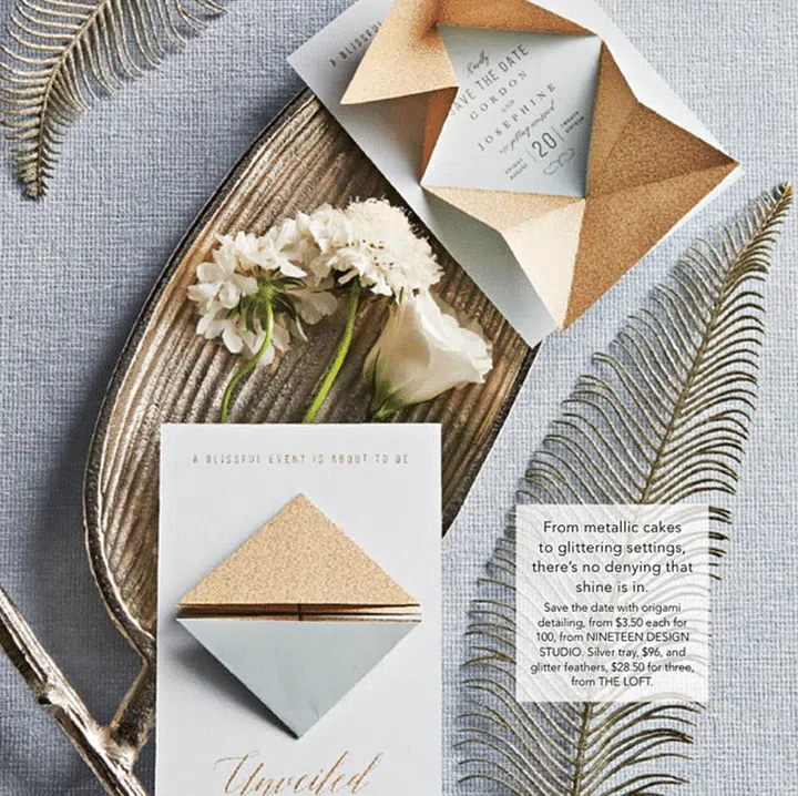 Going for a glamorous theme but afraid it’ll be too much for the invite? This origami invite by Nineteen Design brings in just the right amount of glitter for the invite to look elegantly glamorous. The way the invite unfolds to reveal its details will intrigue your guests, it might even become the most memorable invite ever received. Completely worth the investment.