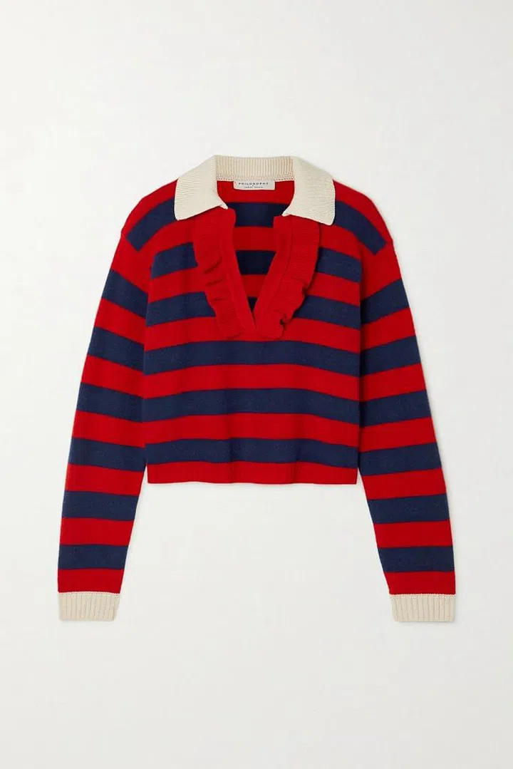 Ruffled Striped Wool & Cashmere-Blend Sweater, S$639, Philosophy di Lorenzo Serafini at Net-a-Porter