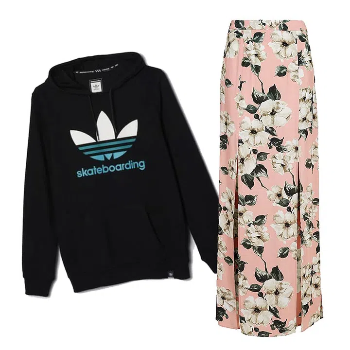 One beautiful way to feminise a hoodie is to wear it with a maxi skirt. Contrasting the heavier fabric of the hoodie with the lighter maxi skirt makes a wonderfully dynamic outfit that’s super chic too. Image: Adidas, Net-a-Porter