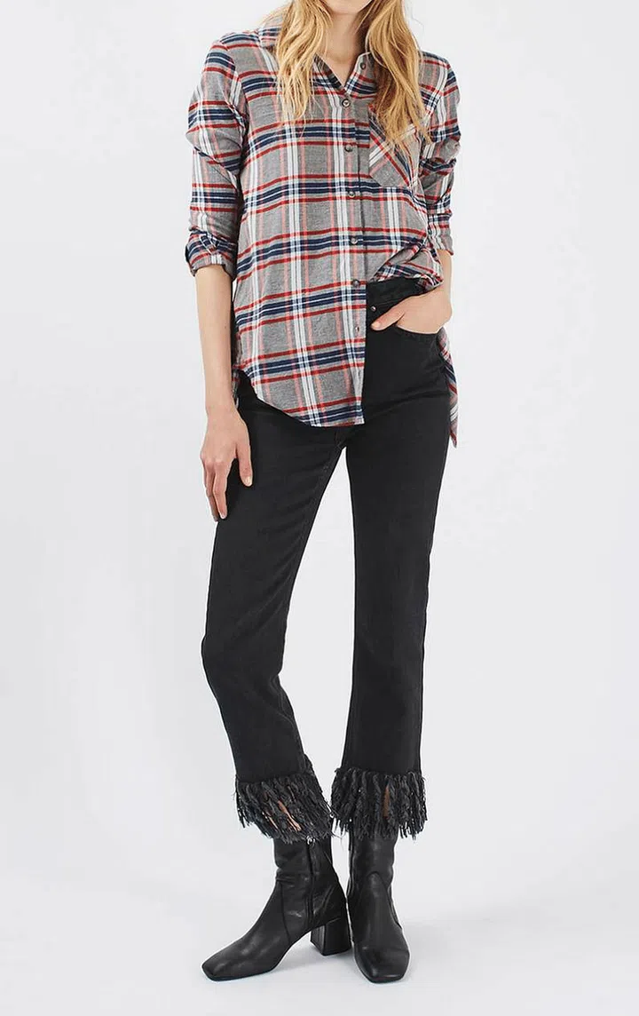 You can go super casual and tuck your flannel shirt into a pair of skinny denim jeans. Wear high-heeled boots or pumps for a chic finish to your boyfriend outfit. Image: Topshop