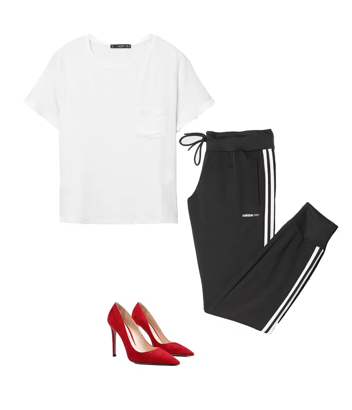 Every man has a comfy tee that they have had for a number of years. Luckily, this is another piece you can steal thanks to the super chic logo tee trend. While I wouldn’t recommend going in the Vetements direction and wearing a DHL tee, lazily half-tucking your large tee into some denim skinnies and wearing high heeled pumps looks hot. Put on some chic sunglasses you’ve achieved that effortlessly stylish look that is oh-so-trendy right now. Image: Adidas, Prada, Mango)
