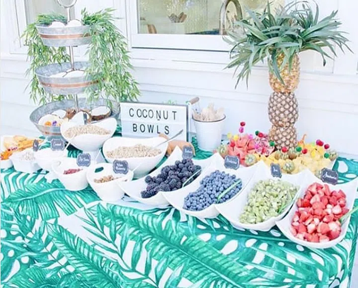 For a laidback, summery party, this DIY coconut bowl bar is the perfect treat to beat the heat. Include fresh coconut halves, various fresh and dried fruit toppings, and nuts. Plus, just how double tap-worthy does this table look?