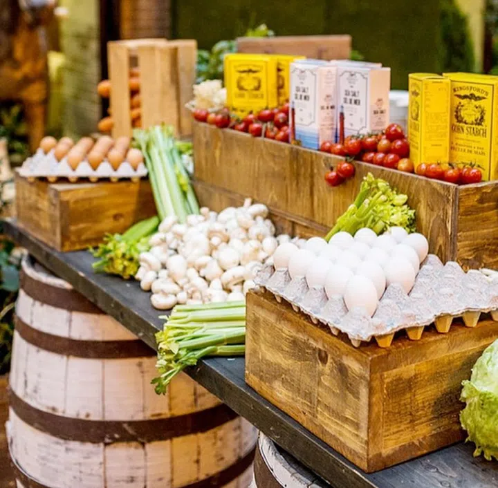 Jazz up and complement your rustic theme with this decorative display of wholesome ingredients for an omelette station.