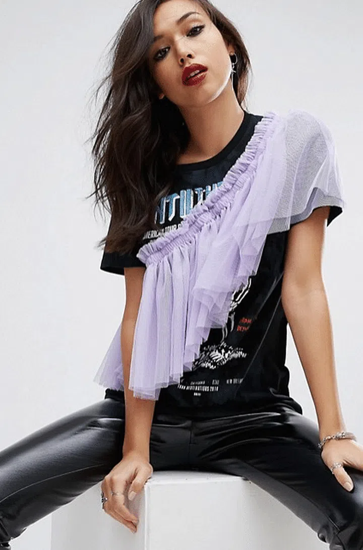 Check out this shirt from Asos’ She’s With the Band festival collection. If you have random fashion fantasies, let draping tulle across your band tee be one of them. We may not have Coachella, but you can rock this piece at, say, the F1 concert – you’re bound to make heads turn.