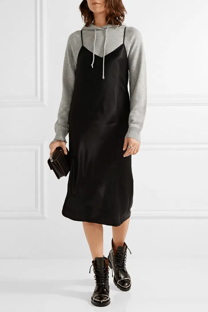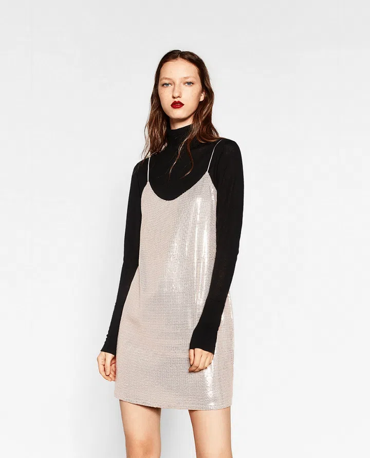 Want to try your hand at mixing and matching? Throw on a metallic slip dress over a black graphic tee, or layer a maroon slip dress over a camel shirt. Photo: Zara