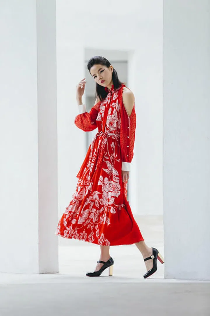 This is totally the perfect Chinese New Year dress, right? Its dressy enough for any posh reunion dinner but it’s also got some sexy slits which will keep you cool and funky when you head out to party afterwards. Jasmine is wearing a Floral Dress by Fendi and shoes by Christian Louboutin.