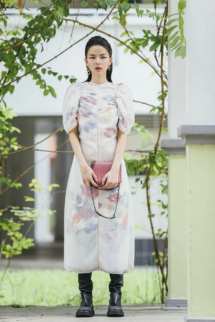 This one is for the fashionistas … We love the soft flower print – perfectly auspicious – but the wader boots give the whole look a certain streetwise edge. Oh, and they’re great if it starts to rain! :) Jasmine is wearing Puffy Sleeve Dress and Boots by Celine; with Mixi. 22K Gold Twist Ring and Bangle by Poh Heng and an Intrecciato Nappa Scales Shoulder Bag in Dusty Pink by Bottega Veneta.