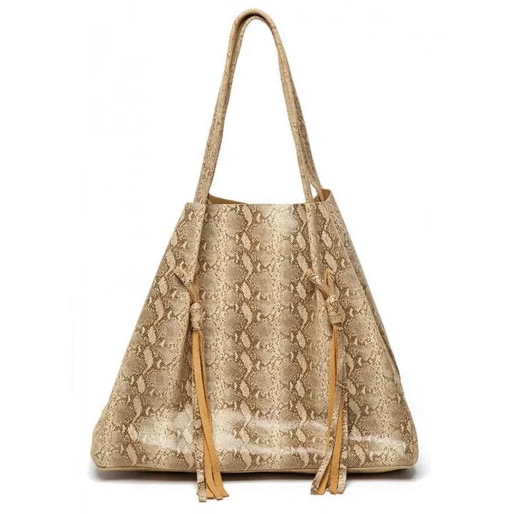 For ladies who fancy more of a statement-making tote, this one is perfect for you. The exotic snakeskin print with fringe detailing on both the front and back sides is bound to turn heads.
