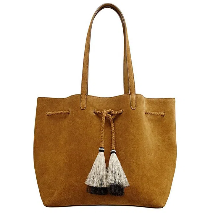 This camel suede tote boasts an interested braided drawstring that's trimmed with the label's signature horse hair tassels. This spacious tote will be able to hold all your daily essentials and more.