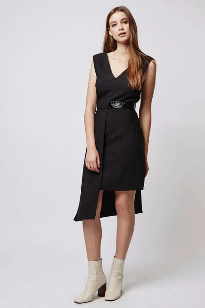 The little black dress ups the ante with this asymmetric style and a vinyl tab waist. Shop this dress at Topshop.