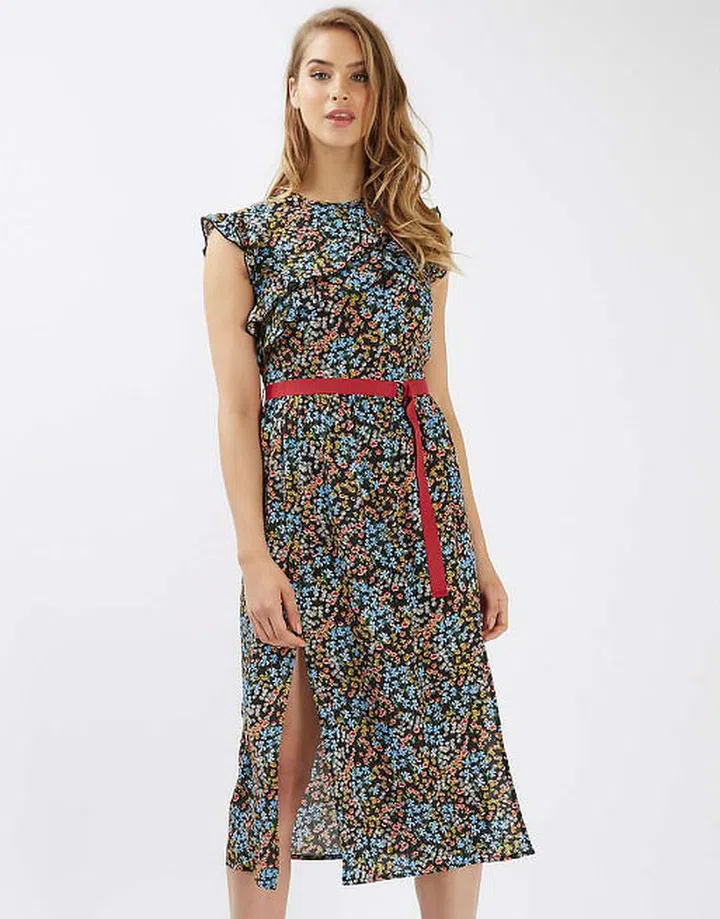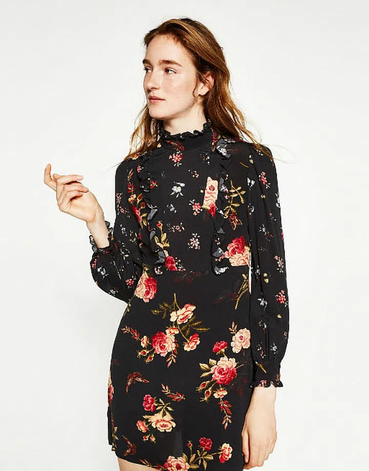 It’s not easy to strike a balance between overtly feminine details and the strait-laced sensibilities of the office, but this dress nailed it. The bright floral print brings a “powdery” perspective to the sophisticated black backdrop of this fast fashion dress.