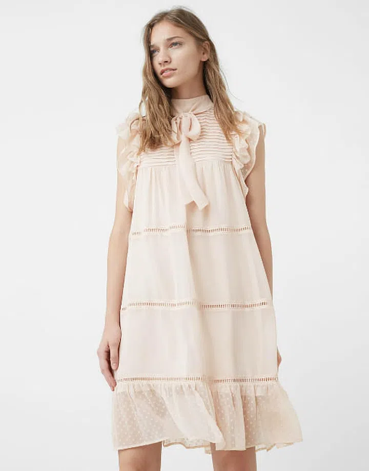 With a modest neckline and a generous panel of ruffles bedecking the hem, this dress can easily take you from your desk to after-work cocktails.
