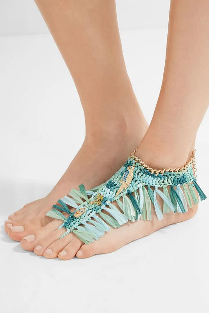 This anklet is handmade from colorful straws and knotted for a tassel effect. This piece is definitely a bold take on eclectic elegance.