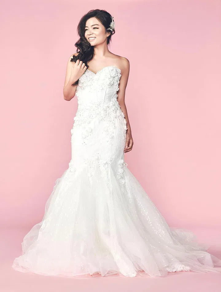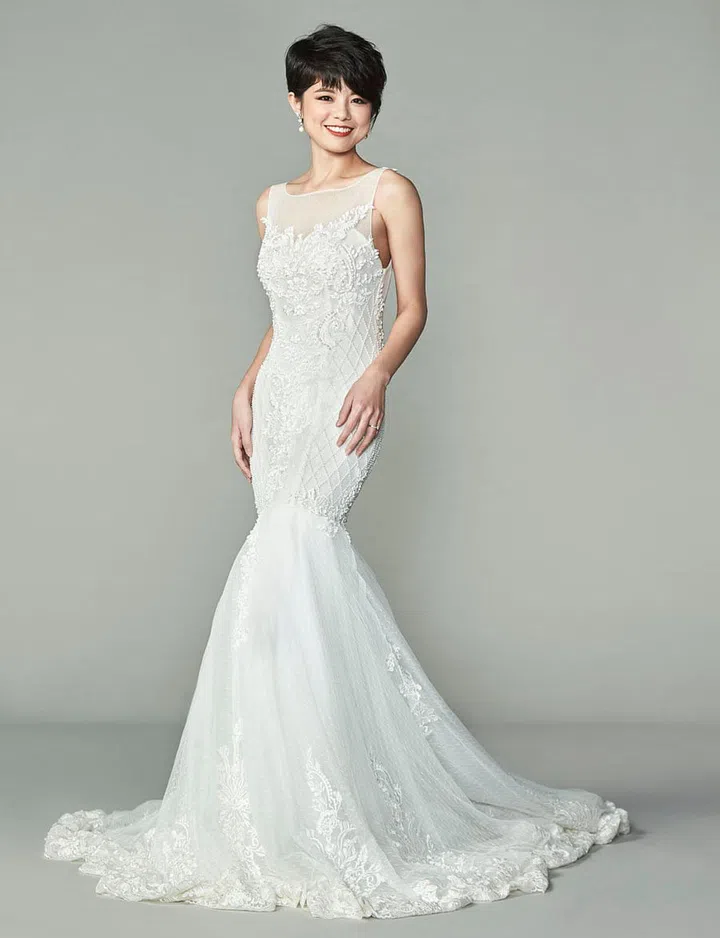 we say Phyllis' lithe physique is tailor-made for the mermaid gown. This particular gown also enhances her curves with ornate detailing and trims in all the right places. The classic boat neck flaunts her long neck beautifully.