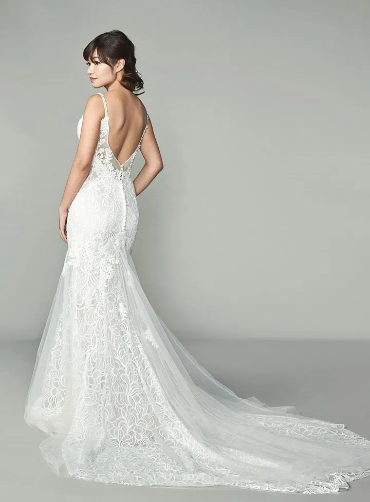 we say Claire's slender build goes well with a number of styles, but this light-as-air A-line gown that further accentuates her curves is particularly feminine and ethereal. If you're slim and lithe, you can also pick a dress with heavier and thicker fabrics like duchesse satin and heavier silks. This adds a more tailored line to your silhouette for a more impactful presence.