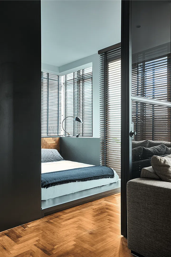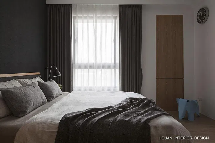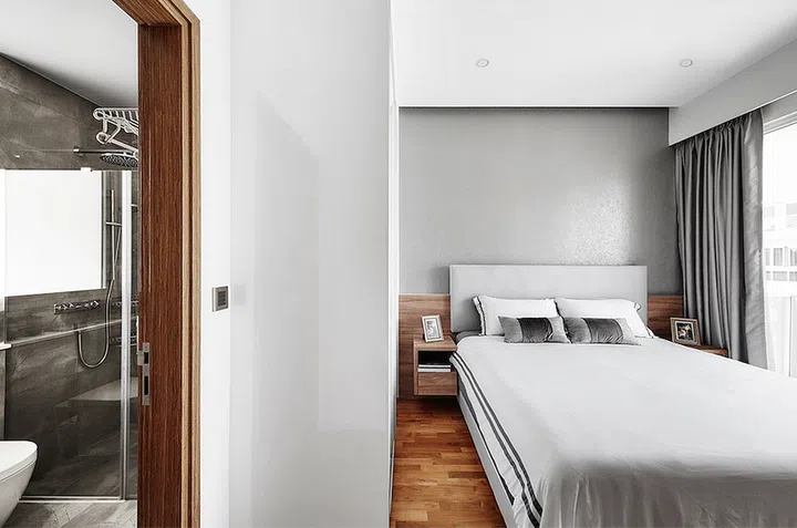 For a restful ambience in the master bedroom as well as an overall holistic look, the homeowners chose a dark grey palette, complemented with wood finishes on the headboard and cupboard.