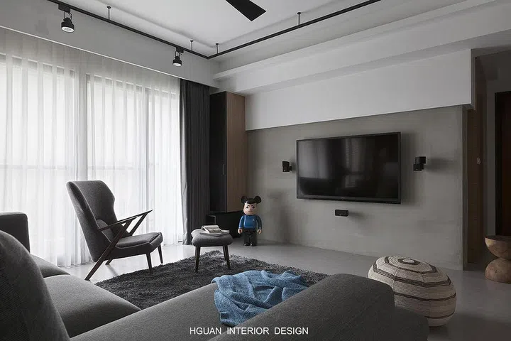 The designer and homeowners of this home furnished it with furniture in a singular colour tone to match the concrete screed wall behind the TV.