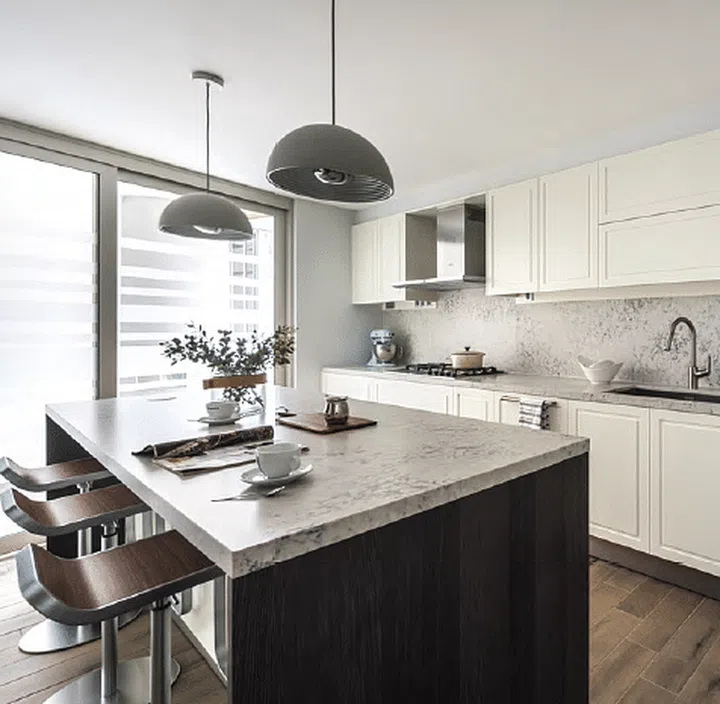 To create the look of an expansive and open kitchen space, the team utilised a greyish Silestone engineered quartz for the kitchen backsplash and countertops, pairing it with white Hamptons-style cabinetry and a dark brown kitchen island base.