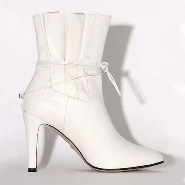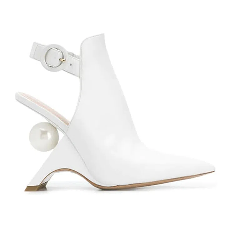 Sporting fluid lines and a modern sensibility, these white calf leather ankle boots are a unique spectacle in their own right. Featuring a faux pearl embellishment resting on the angled heel, these pointed toe boots are designed with a cut-out open back and a slim buckled strap.