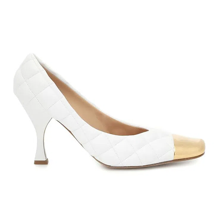 Crafted from plush white nappa leather designed with hand-stitched matelassé quilting, these square-toe pumps from Bottega Veneta are completely on trend.