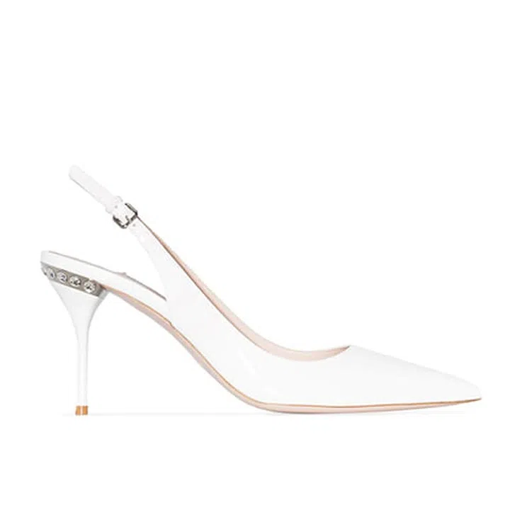 These sleek slingback pumps from Miu Miu feature a sharp pointed toe and are made from glossy patent leather in white. Peep the crystal-embellished panel decorating the peak of the heel – a subtle detail that gives these charming slip-ons a dazzling twist.