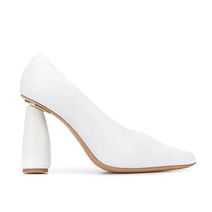 Rendered in white with a caramel-hued sole and gold-toned detailing, these minimalist shoes feature the brand’s prominent employment of the sculptural heel.