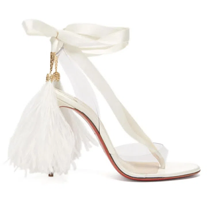 Inspired by cabaret dancers, these white satin sandals from Christian Louboutin feature feminine satin ribbons that stem from the front to form a flip flop-esque strap before extending up to coil around the ankles. Fastened with transparent PVC straps to secure your feet to them, these shoes are ornamented with tassels made from ostrich feathers bound together with a decorative gold tone mould.