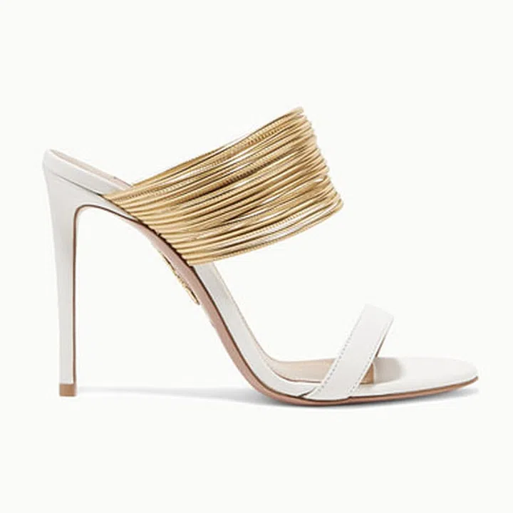 Highlighted by shiny gold leather strappy cuffs, Aquazzura’s sleek Rendez Vous sandals see themselves rendered in white for an elegant effect. Set with sky high stiletto heels that are thin as a tack, these shoes will finish your next party look with panache.