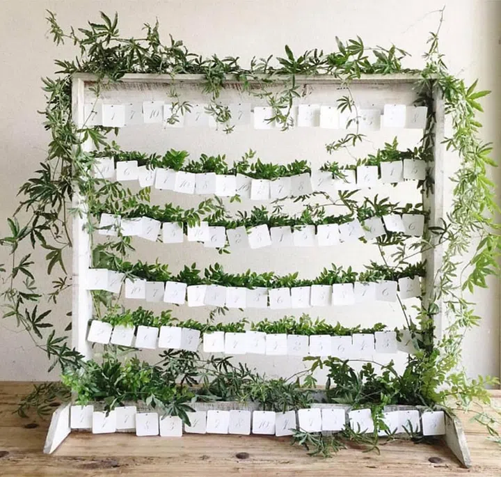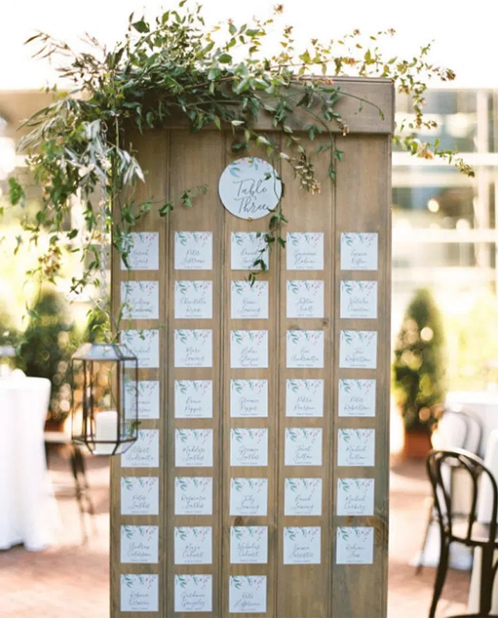 A wooden board decorated with freewheeling arrangements is all you really need to create this rustic escort card/guestbook wall.