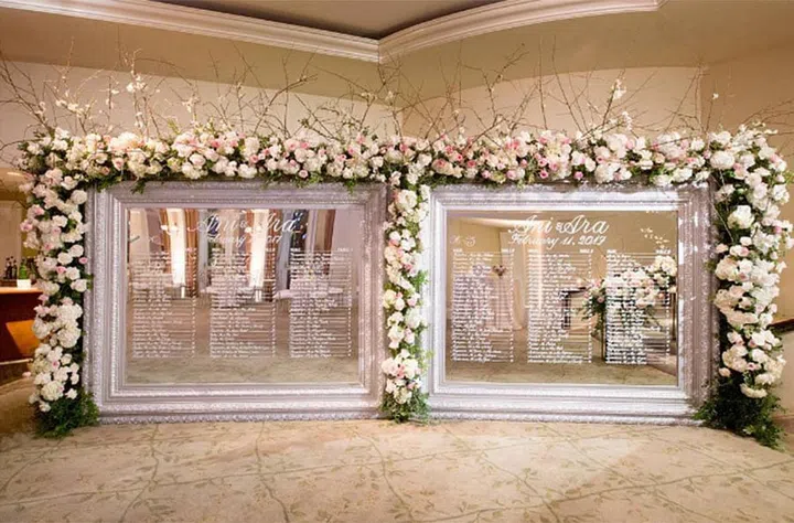 Whether as seating plans or for guests to scribble their well wishes, these giant frames decorated with cherry blossoms and lush white blooms impart elegance to your wedding venue.