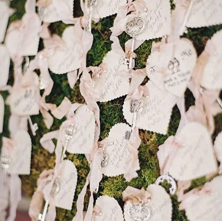 Here, sweet heart-shaped escort cards and tiny key are pinned to a moss-covered background for a pretty garden-esque feel. Have the cards penned with messages from your loved ones instead.