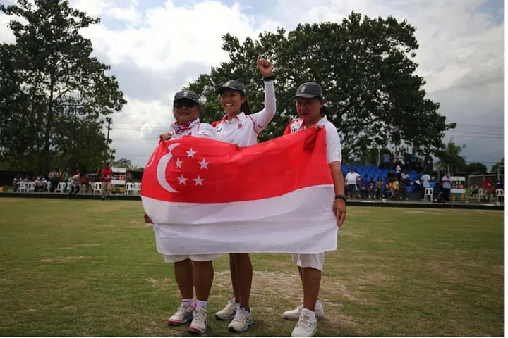 Lawn bowlers Goh Quee Kee, Shermeen Lim and Lim Poh Eng brought the first gold for Singapore when they triumphed the Fillipino team in the women’s triples event.