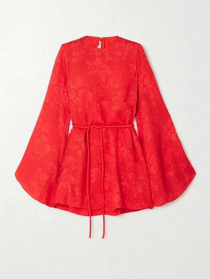 This mini dress is made from crinkled silk-jacquard woven with blooms reminiscent of those found in the English countryside. It has a ’70s-inspired shape with flared sleeves and a knotted tie to define your waist.