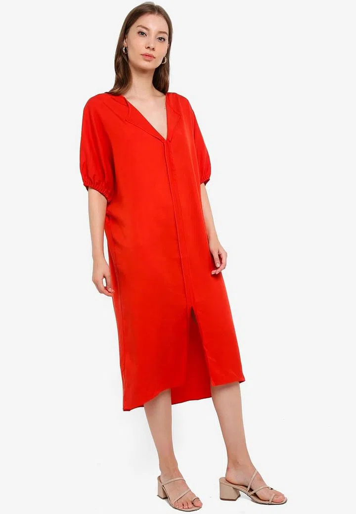What we love about this number is its plunging neckline. Complement its vermillion hue with a delicate gold necklace and a pair of white heeled sandals.