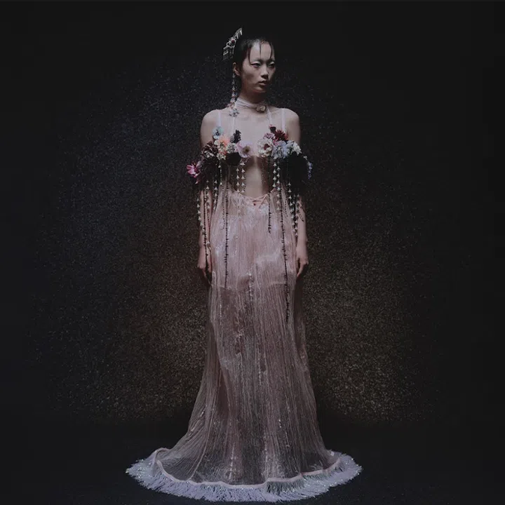 Why it’s one brand to watch: Founded by designer Daisuke Tanaka, who launched the brand immediately after graduating from fashion school in Osaka, Tanakadaisuke infuses embroidery with a touch of fantasy and romanticism, incorporating elements such as body embellishments, florals, and intricate beaded patterns. With collections showcased twice at Rakuten Fashion Week, the brand’s motto is “May you meet the unseen self in you with clothes that look like magic.” This season, Tanakadaisuke collaborates with Japanese stylist Takeru Sakai on a capsule collection that blend fantasy with sartorial edginess. Imagine crystal bijou body chains, rhombus crystal chain tops, pink heart bijou collars, along with embroidered hoodies, sweatpants, and lapel jackets. Among the highlights is the Sakura Mist dress, which transitions from a soft cherry blossom pink to dynamic tulle ruffles at the hem.