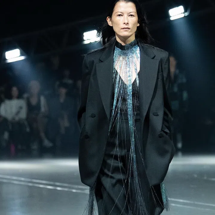 Why it’s one brand to watch: After gaining experience in various design teams across New York City and Tokyo, Kanako Sakai established her namesake brand, which blends clean-cut, contemporary tailoring with traditional Japanese techniques. The brand aims to share Japan’s culture and artisanship with a global audience by exploring various craft trades in her home country, such as indigo dyeing in Tokushima, creating selvedge denim in Okayama, and Suminagashi (a paper marbling technique) in Kyoto. For the brand’s first-ever fashion show at Tokyo Fashion Week for the Spring/Summer 2024 season, Sakai explored a cooler-toned colour palette, incorporating splashes of pinks, blues, reds, and blacks onto minimal silhouettes, expressed through glitter fabrics, fringed hems, cloud-like textures, and hexagon patterns.