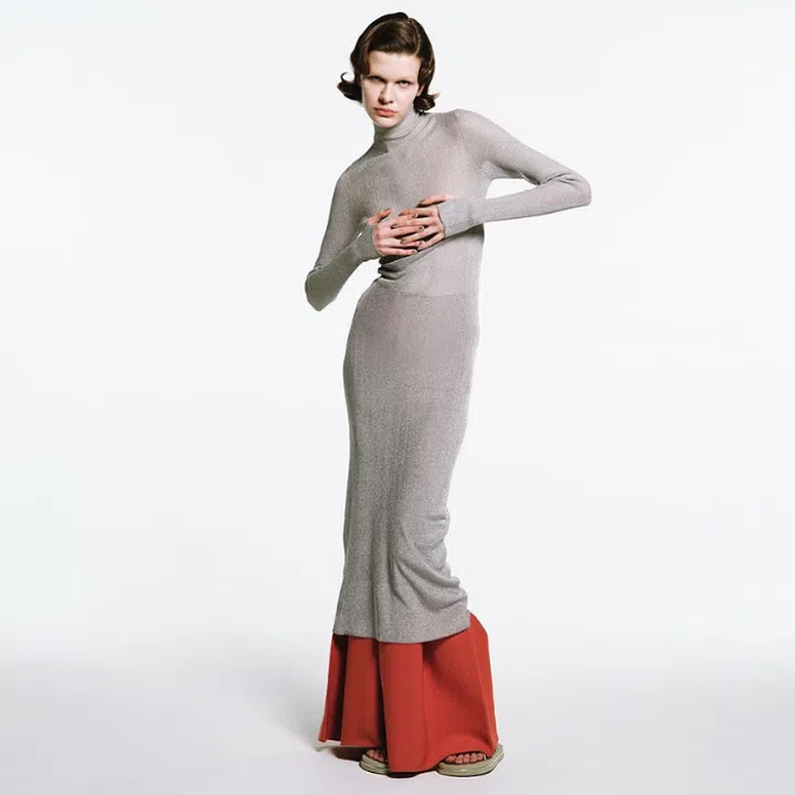Why it’s one brand to watch: Designed by Yusuke Takahashi, formerly of Issey Miyake Men, CFCL, which stands for “Clothing For Contemporary Life,” specialises in modern knitwear crafted using 3D technology and environmentally-friendly polyester yarns. In 2022, CFCL became the first fashion brand in Japan to achieve official certification as a B-Corporation, highlighting its commitment to social and environmental responsibility. The S/S’24 collection draws inspiration from nature, showcasing a colour palette of pink, beige, green, white, and black. Picture thin-layered turtlenecks designed to be worn under black ensembles, tube dresses, sweaters, A-line dresses, and metallic sequins embellishing grey and black dresses.