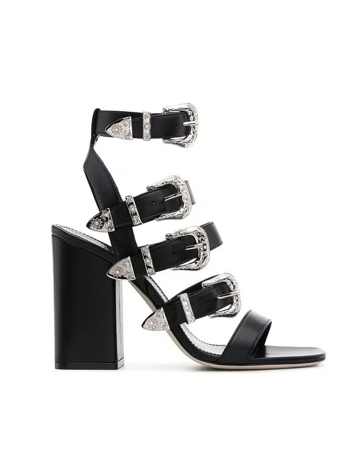 The classic cowboy belt buckle gets reinterpreted in these party-ready sandals.