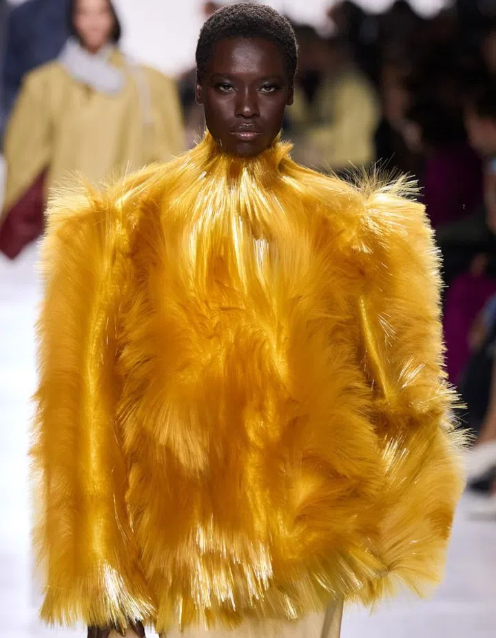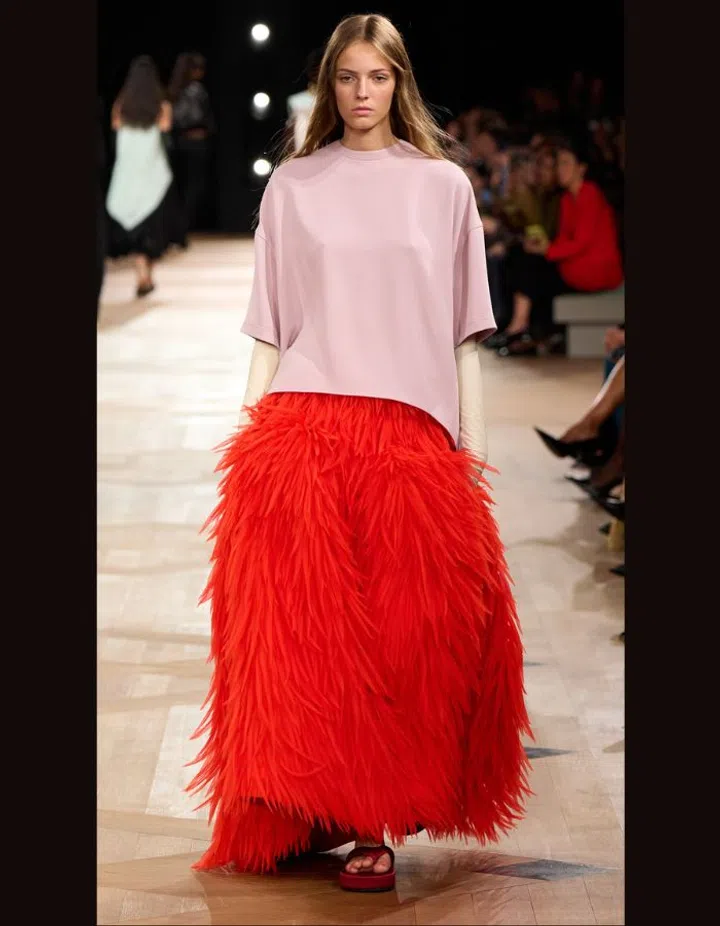 Louise Trotter’s debut designs were a gentler, more feminine version of the artistic direction that her predecessor, Matthieu Blazy, took. The 49 year old British designer had held design leaderships at Carven, Lacoste, and Joseph, and is known for her refined, understated aesthetic. At Bottega Veneta, Trotter introduced novelty textures, more oversized volumes, and dynamic movement, incorporating fringe, feathers, and sculptural tailoring. The use of recycled fiberglass and innovative materials added a tactile dimension, while the iconic BV intrecciato got reimagined, the refreshed versions of iconic bags like the Lauren and Cabat celebrated the house’s traditions and classics.