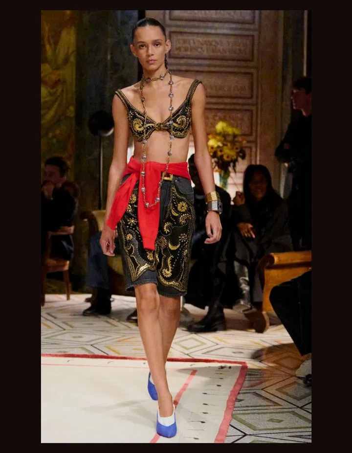 Dario Vitale, 42, presented a divisive collection for Versace that was a bold reimagining of the brand’s red carpet aesthetics. The love-it-or-hate-it presentation drew from Gianni Versace’s iconic 1990s Miami Beach sensuality, with a seedy new darkness. Vitale introduced a punky sensibility, with embellished hot pants, metallic bra-and-skirt sets, and high-waisted baggy jeans styled with unexpected knitwear, loose tailoring and heavy leather bombers. It steered away from the golden girl glamour of the Donatella Versace years, and showcased a more complex sex appeal in clashing genres and textures. Coming from Miu Miu and Bottega Veneta, Vitale brings a louche, rebellious vision that heralds a generational shift in luxury fashion.