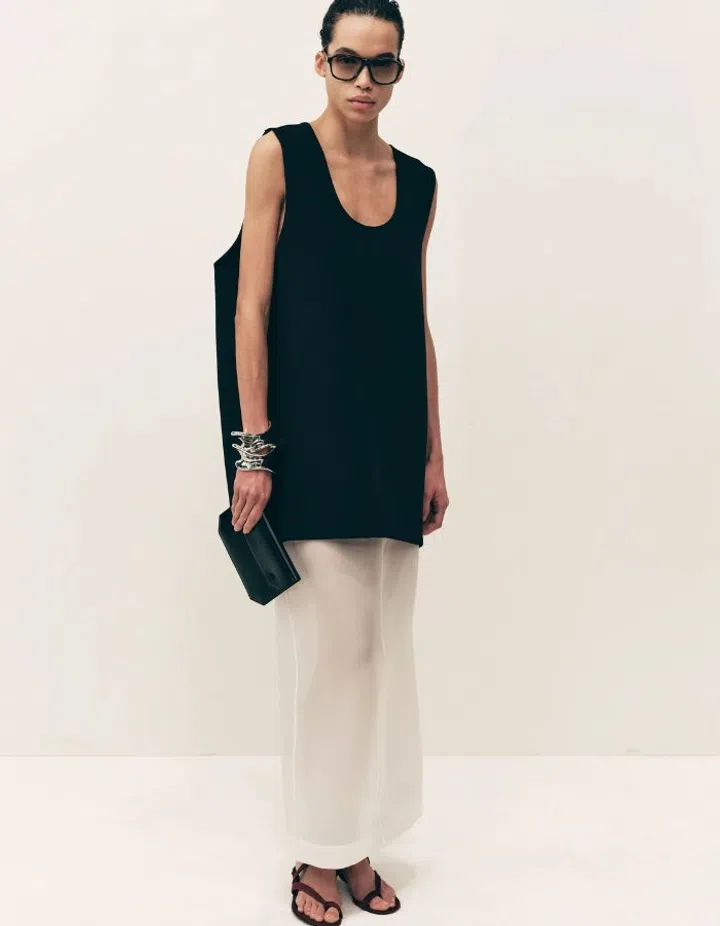 A lesson on weekend chic: Secure yourself a structured tunic and wear it with a sheer skirt and a pair of slides to turn heads.