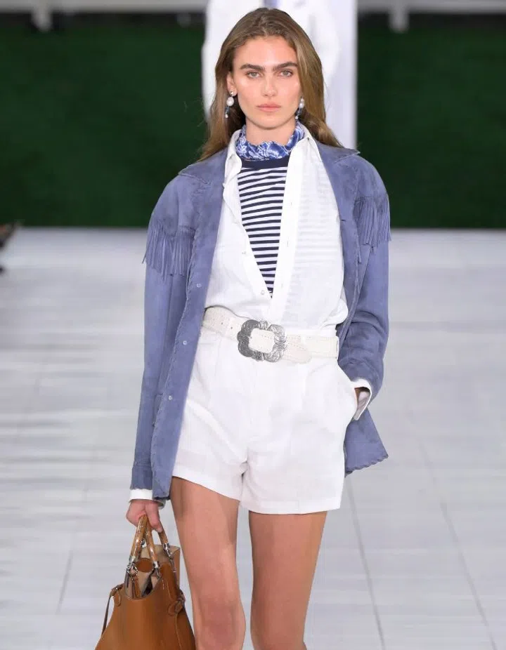 We can totally imagine this look on Parker Posey in The White Lotus. Her character Violet Ratliff, an affluent Southern beauty, is a picture of posh in a classic white shirt unbuttoned layered with a blue-and-white striped T-shirt tucked into a pair of white cotton shorts. For a dash of drama, a suede fringed jacket, a belt with a western-inspired buckle and blue printed scarf is totally on point.